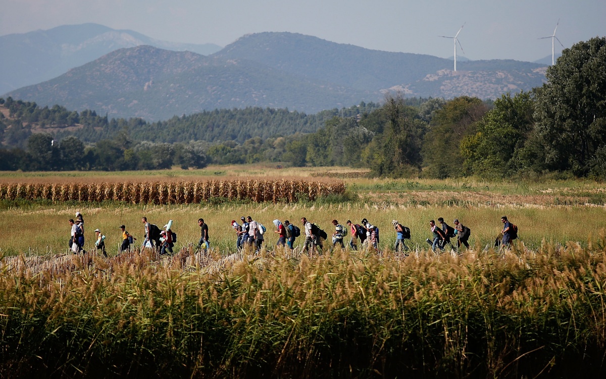 Syrian migrants cross though a cornfield as they walk to a border crossing on the Greek and Macedonian border near Idomeni, Greece. The number of people leaving their homes in war torn countries marks the largest migration of people since the Second World War.