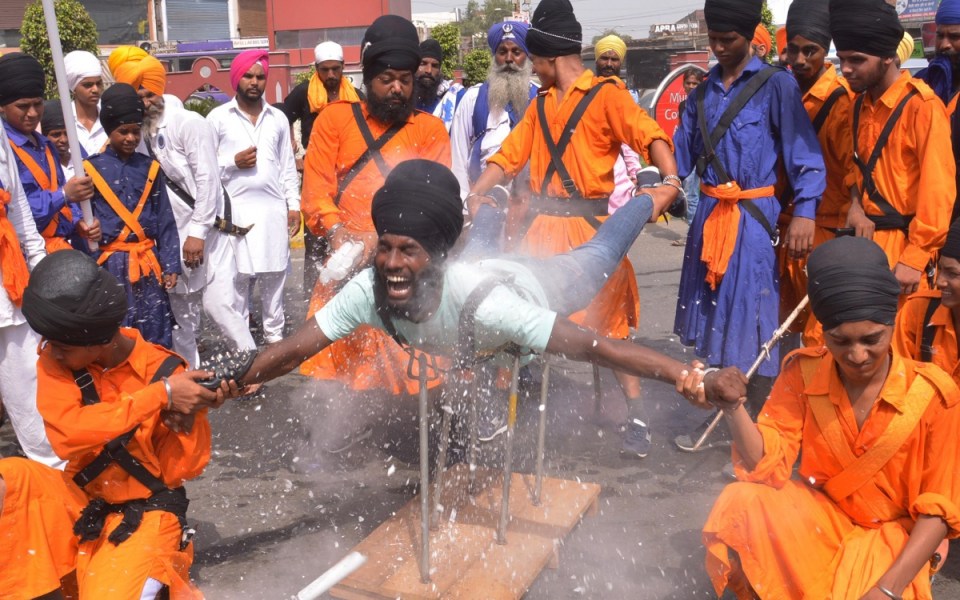 An 'Indian Nihang' demonstrates his martial arts skills during a march to mark the 354th birth anniversary of the famous 17th century Sikh warrior Shaheed Baba Jiwan Singh at the Golden temple in Amritsar, India.