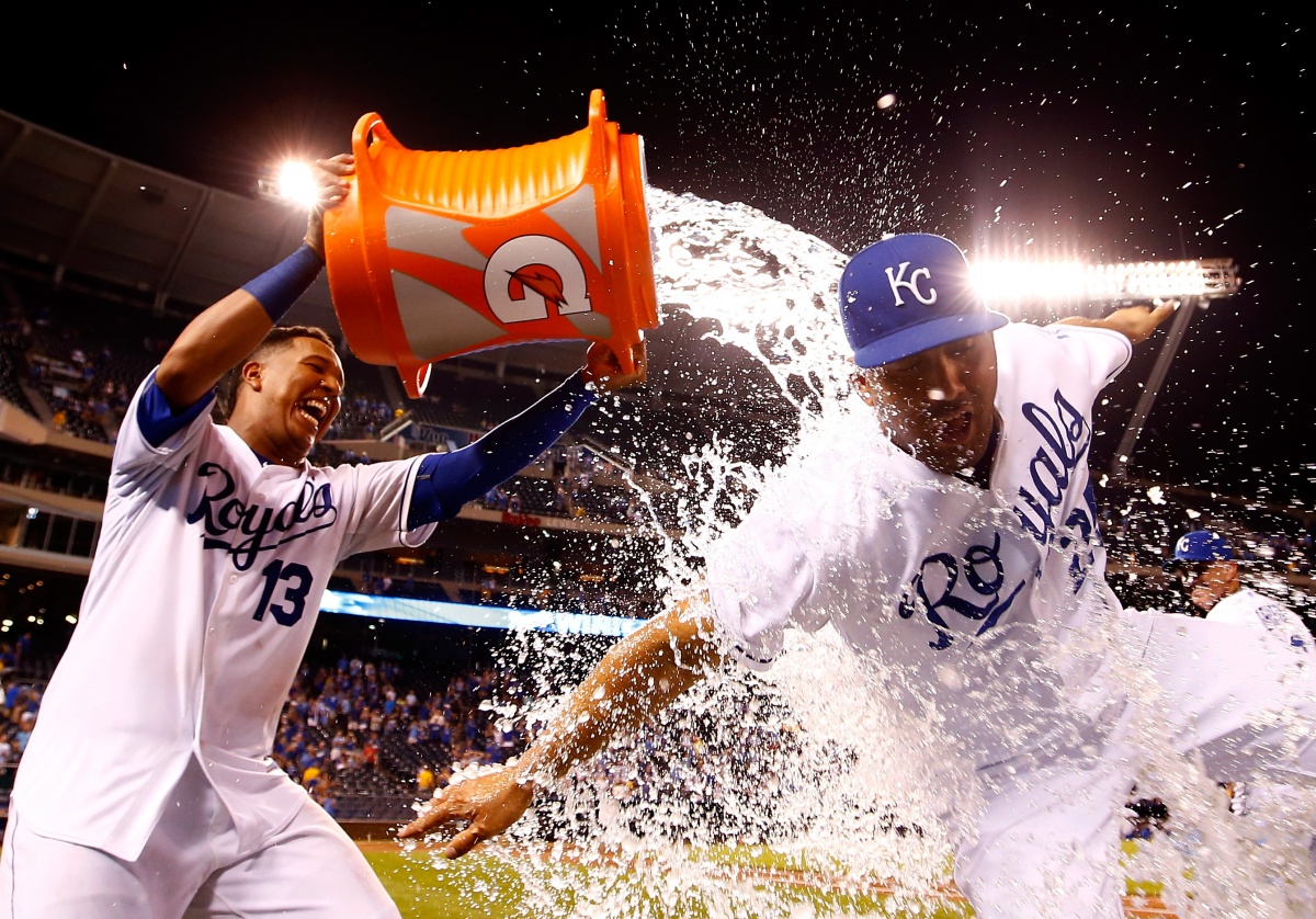 Baseball player Salvador Perez of the Kansas City Royals douses Kendrys Morales with a bucket of water after the Royals defeated the Detroit Tigers 15-7 in Kansas City, Missouri.