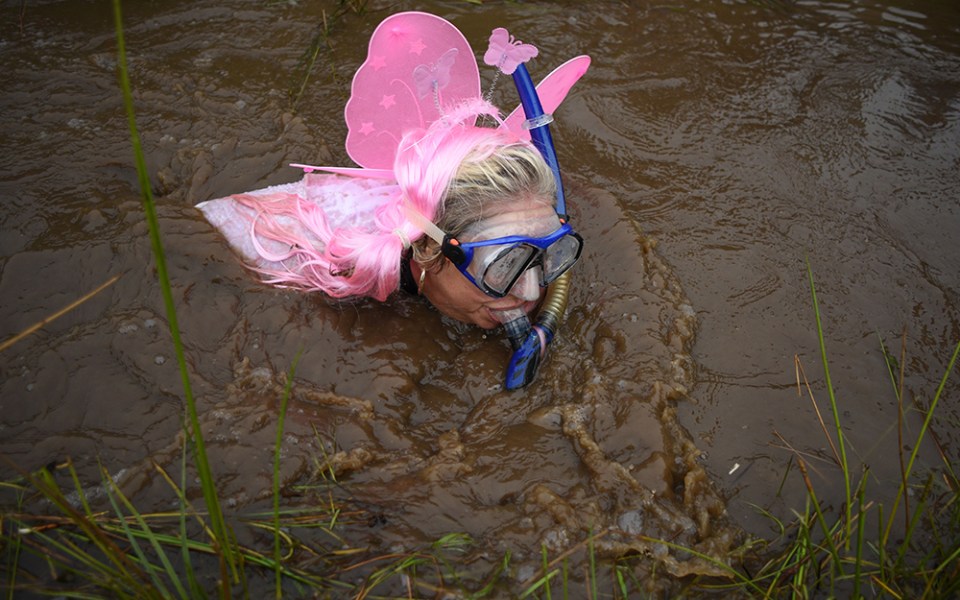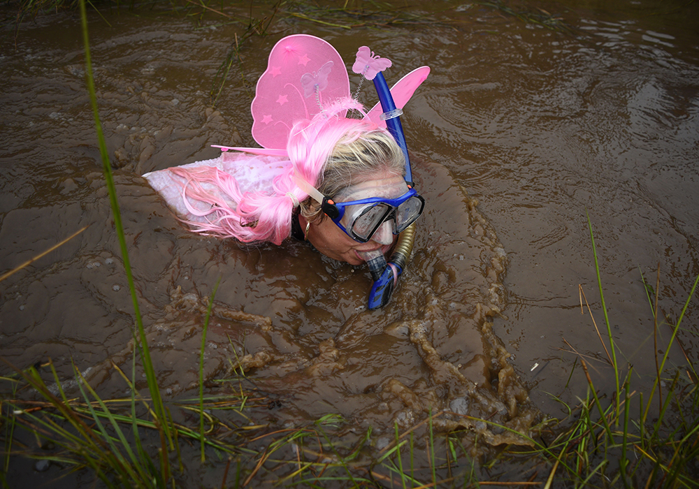 A woman in a fairy costume takes part in the 30th World Bog Snorkelling Championships in south Wales.