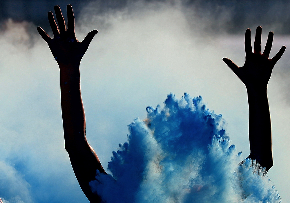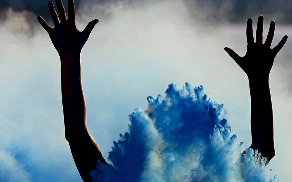 A runner is hit with coloured powder at a rainbow run in the Czech Republic.