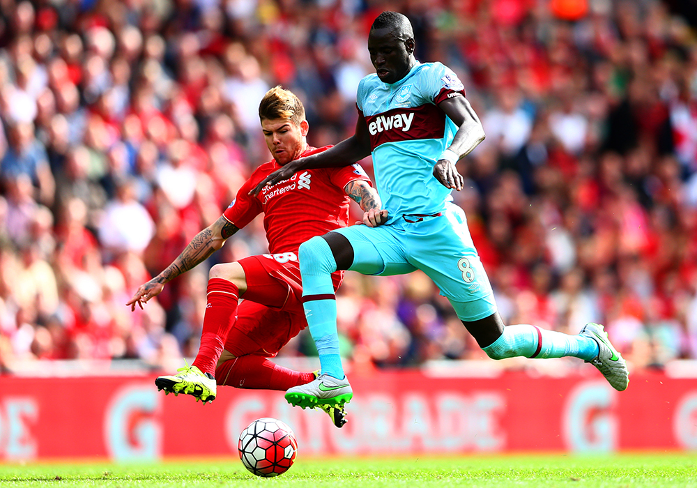 Two football players run after the ball in a West Ham vs. Liverpool match in England.