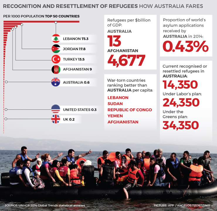 In Australia, 14,350 refugees were recognised or resettled during 2014. That made up 0.43 per cent of the global total, with Australia ranked 22nd overall, 27th on a per capita basis and 46th relative to total national GDP.
