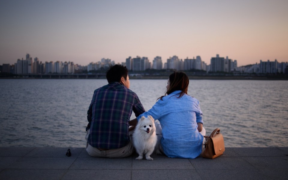 A couple (and a dog) enjoy the view as they sit in front of the Han river is Seoul, South Korea.