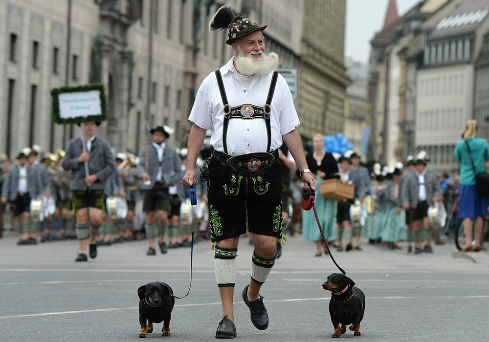 A man in a traditional Bavarian outfit takes part in an Oktoberfest parade in Munich, Germany.