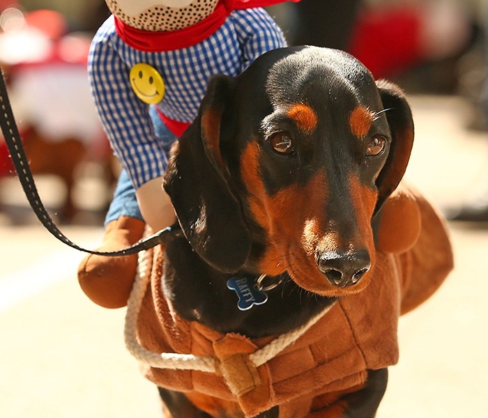A mini dachshund takes part in a Best Dressed Dachshund competition to celebrate Oktoberfest in Melbourne.