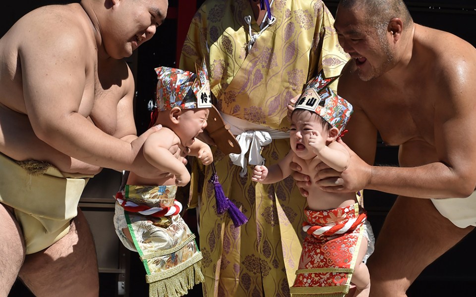Sumo wrestlers hold up crying babies during a 'Baby-cry Sumo' event in Japan. The event is said to bring good health to the crying babies.