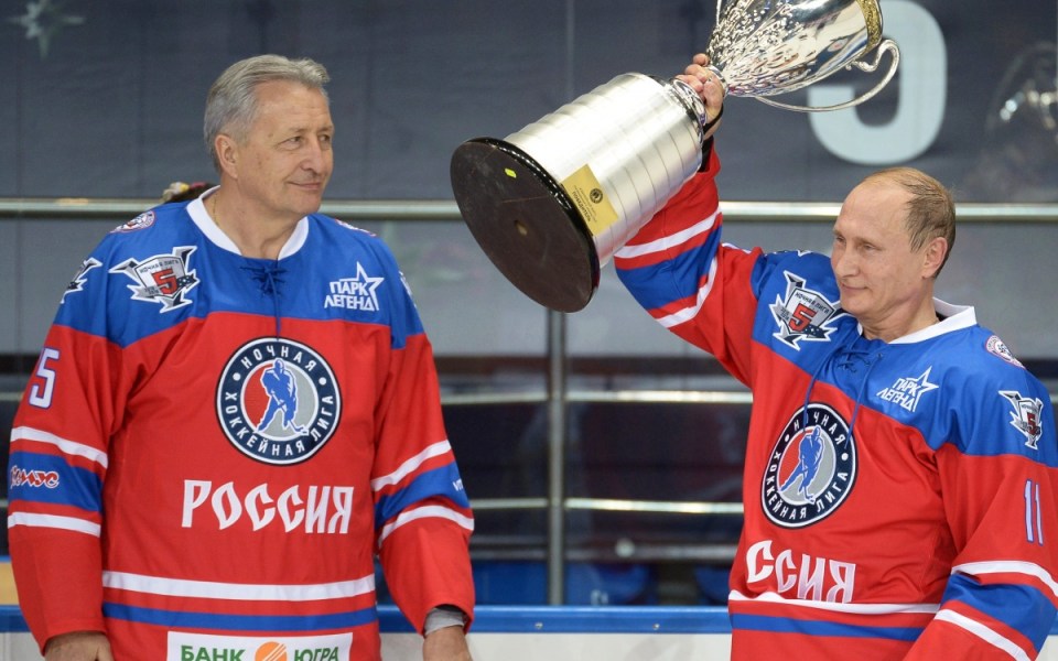 Russian president Vladimir Putin holds up a trophy after celebrating his 63rd birthday with an ice hockey match in Sochi, Russia. The game featured NHL stars against Russian officials and tycoons.