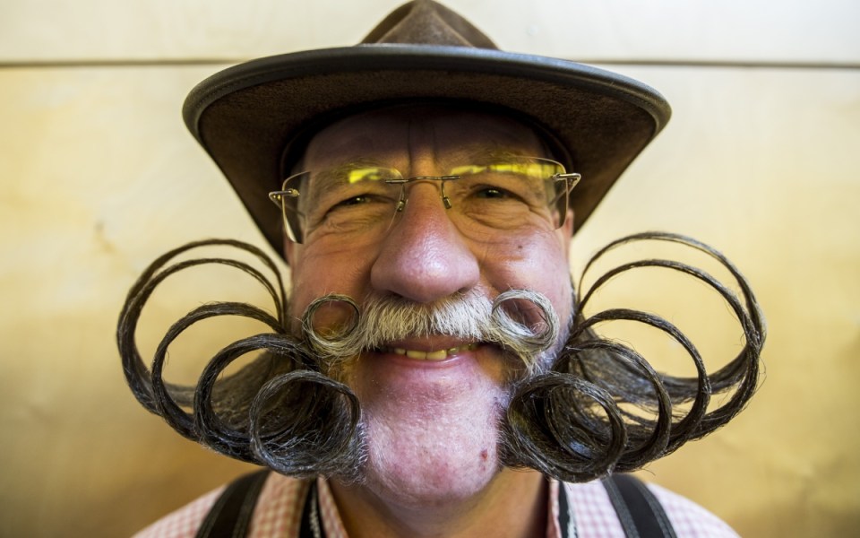 A contestant of the World Beard And Mustache Championships is full of glee as he poses for a picture during the 2015 Championships in Leogang, Austria.