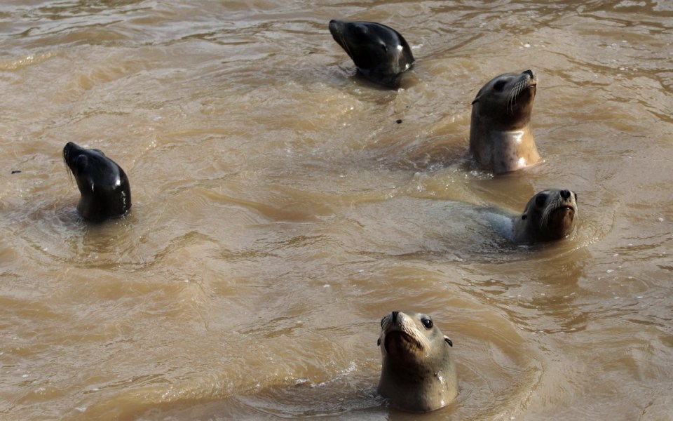 Sea lions congregate in muddy water after a flood in the zoo of Marineland in Antibes, southeastern France.