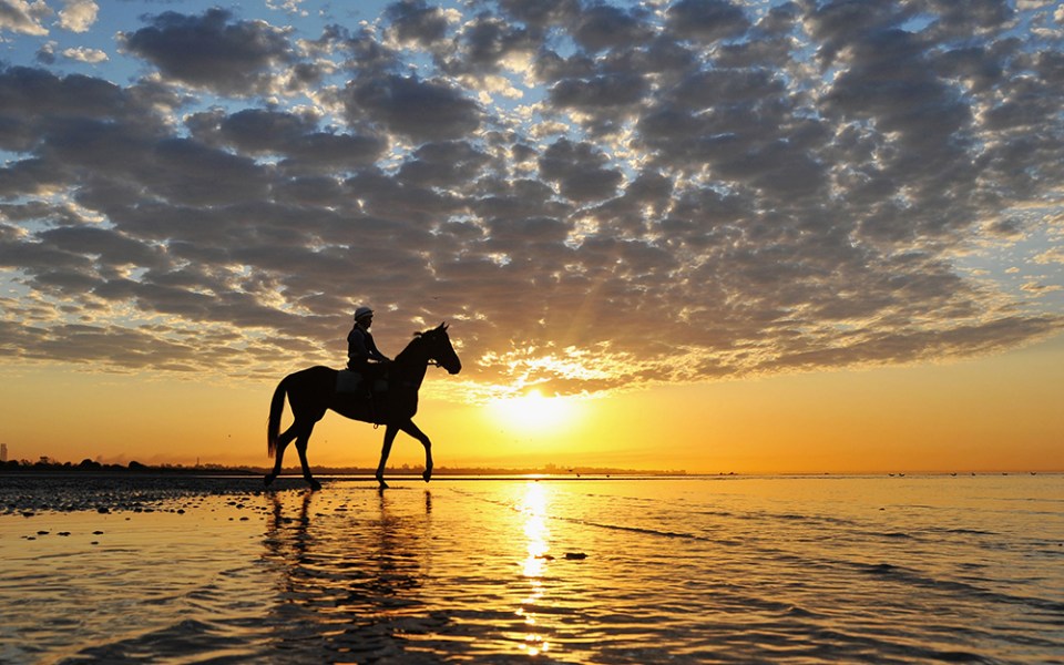 Racehorse 'Who Shot Thebarman' walks through shallow waters at Altona Beach in Victoria.
