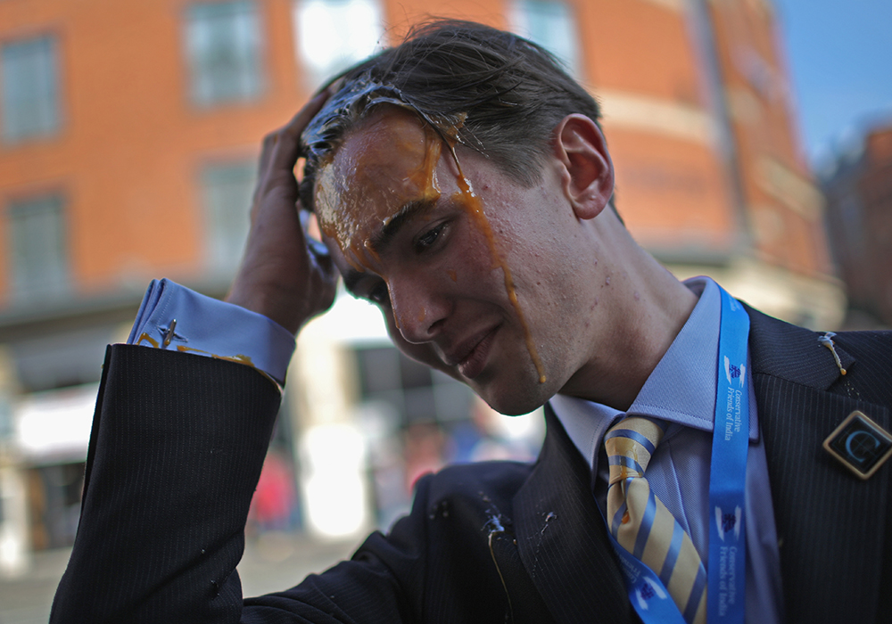 A young British Tory is egged as he arrives at the Conservative Party Autumn Conference in Manchester.