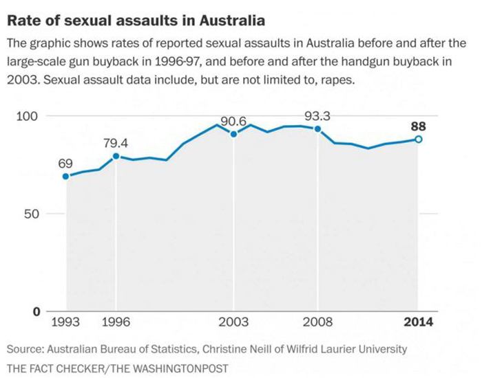 “The rates didn’t go up ‘significantly’ after the buyback and there’s no evidence changes to gun laws in Australia affected sexual assault rates or jeopardised the ability of women to protect themselves,” the Washington Post told readers.