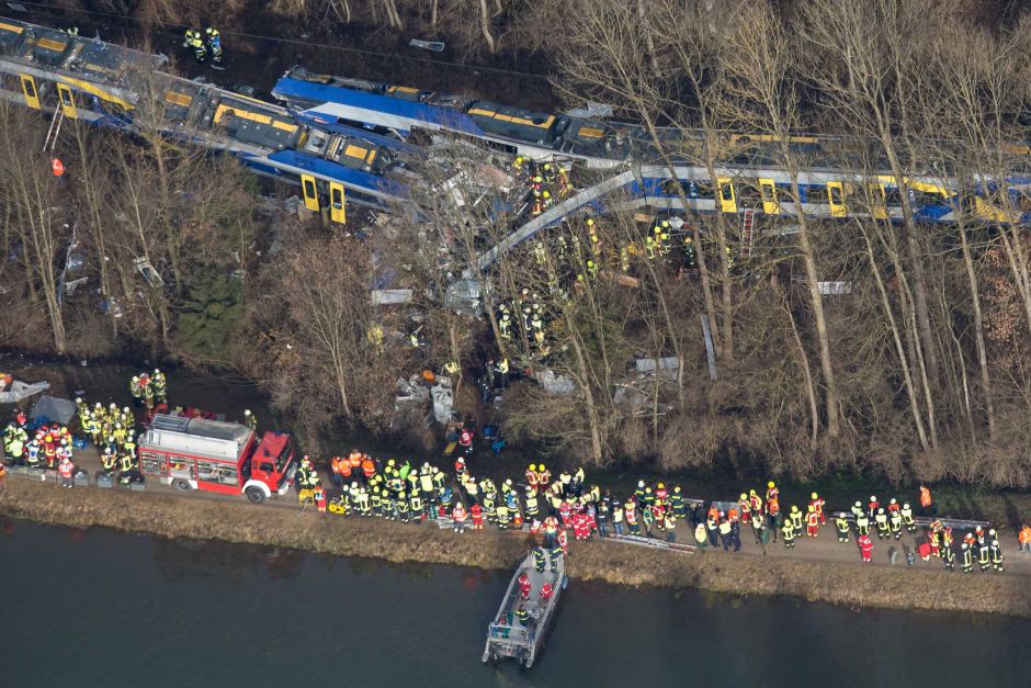 Two commuter trains travelling at high speed crashed head-on near the spa town of Bad Aibling last Tuesday, in one of Germany’s deadliest accidents in years, with one slicing the other apart, ripping a large gash in its side.