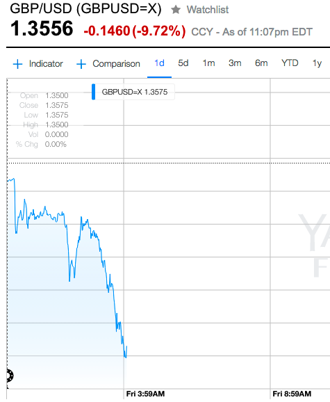 Traders were particularly spooked by returns from Sunderland showing a large majority for the “Leave” camp and just a narrow win for “Remain” in Newcastle.