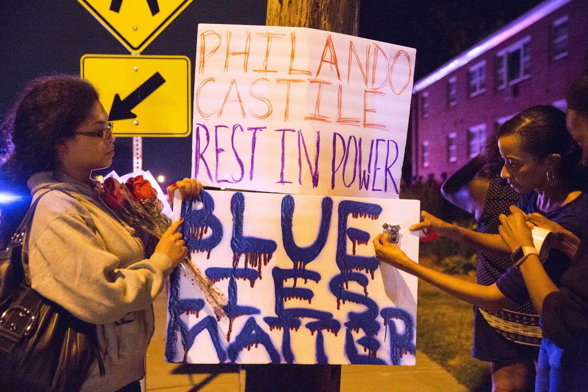 Protester's hang signs on a post near the scene of Philando Castile's shooting. Photo: AAP
