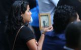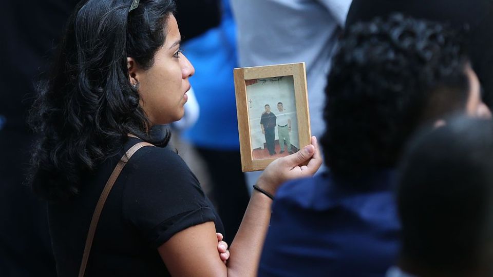The ‘Tribute in Light’ memorial shines two lights where the Twin Towers once stood.Visitors leave flowers, flags and photos at the National 11 September memorial in New York.Visitors to the 9/11 memorial read the names of the 2977 victims of the attacks.A collection of front pages in the 9/11 Gallery of the Newseum in Washington DC.A sign stencilled into the Arthur Ashe Stadium court acts as a memorial during the US Open.