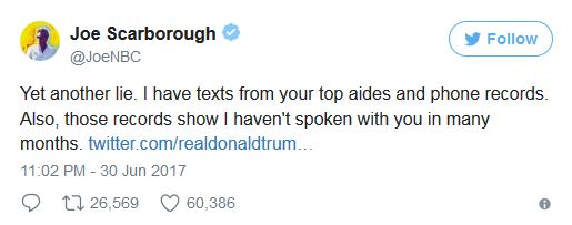 In a response to Mr Trump’s claim Scarborough had called him to get the National Enquirer article stopped, Scarborough tweeted that it was “yet another lie”.