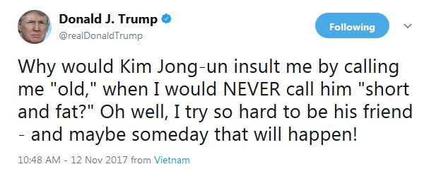 In a response to North Korea branding Trump’s speech in South Korea as “reckless remarks by an old lunatic”, Trump tweeted from Hanoi on Sunday morning: “Why would Kim Jong-un insult me by calling me ‘old,’ when I would NEVER call him ‘short and fat?”‘