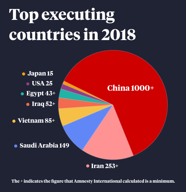 Meanwhile, China remains the world’s No.1 executioner, carrying out more than 1000 estimated executions by lethal injection or shooting each year.