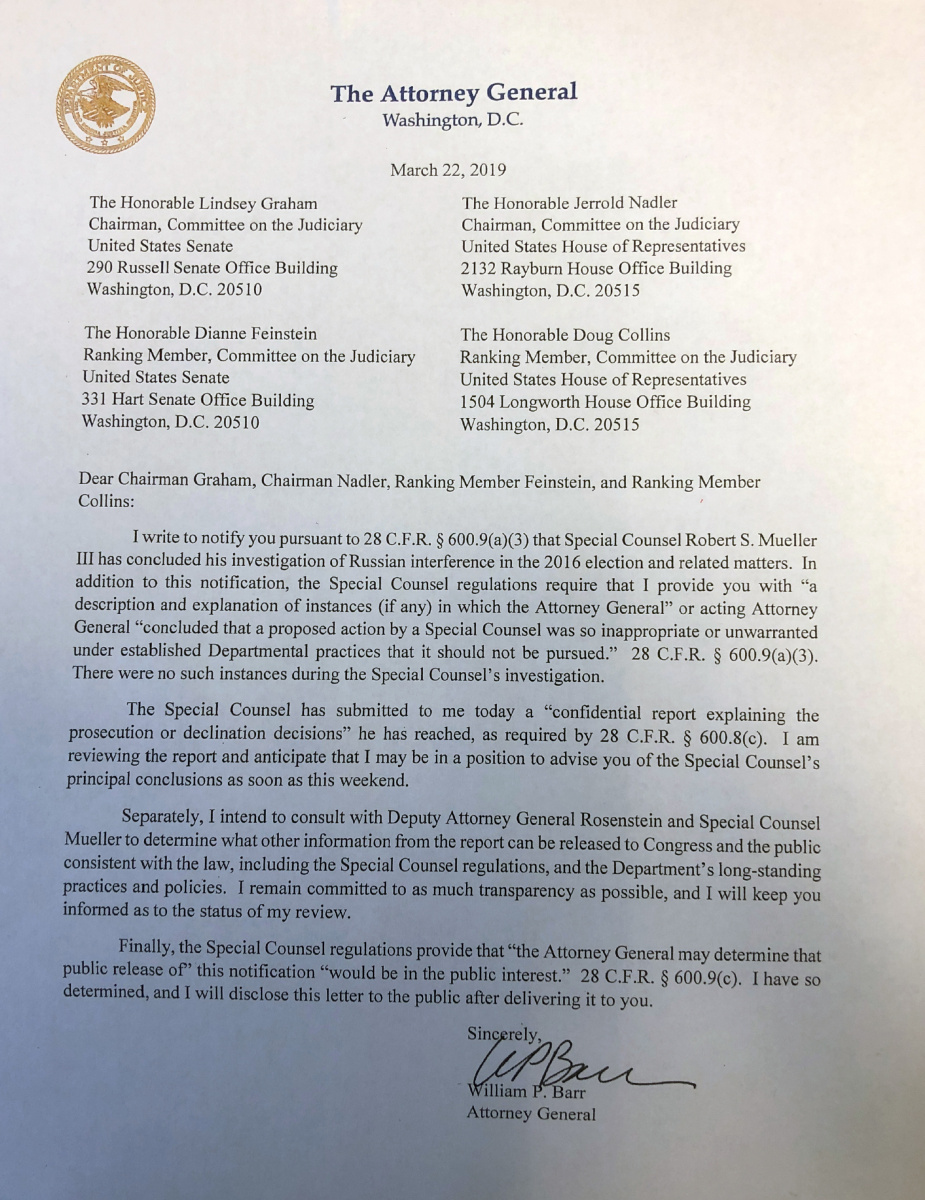 Mueller turned over a copy of his confidential report to Barr on March 22, ending his 22-month-long inquiry. Two days later, Barr released a four-page letter summarising what he said were Mueller’s primary conclusions.