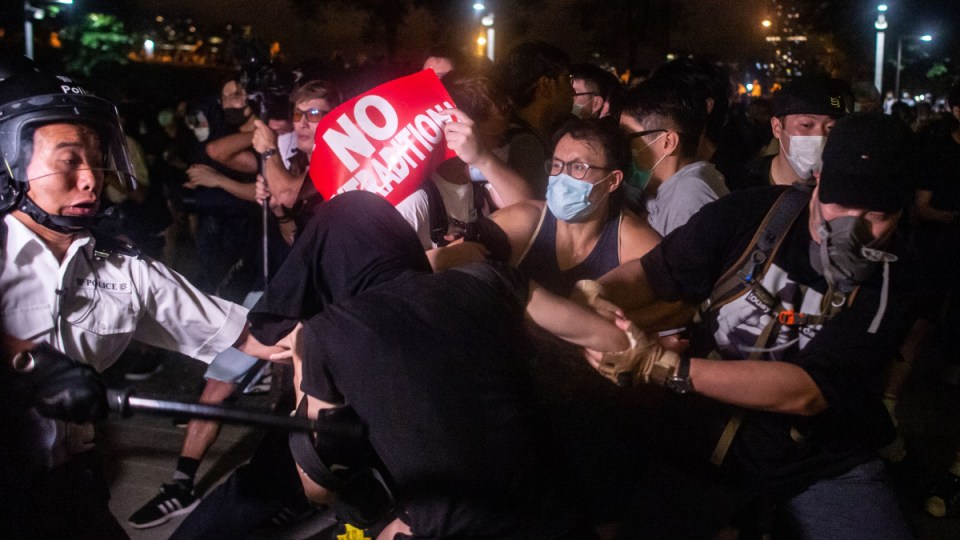 An angry mob protesting plans to allow criminal suspects to be sent to China to face trial was met with pepper spray and police batons as they tried to storm the city’s parliament after hours of peaceful protest.
