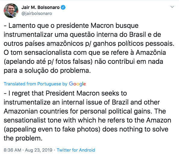 Mr Bolsonaro, who was elected last year after corruption scandals involving the previous government, also accused media organisations of exploiting the fires to undermine his government.