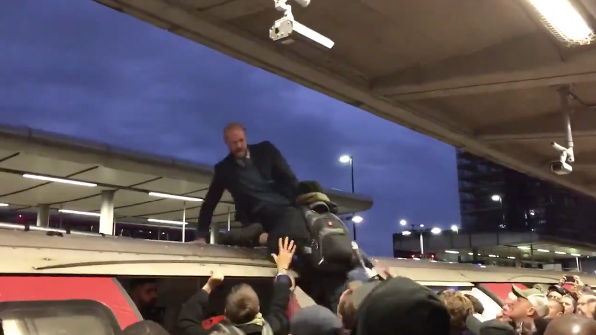 Shocking moment angry commuters drag two #ExtinctionRebellion protestors off the top of a train in Canning Town and attack them. pic.twitter.com/EZAMa9tT2t