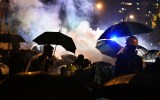 Police surrounded the area on Sunday night and began moving in after issuing an ultimatum for people to leave the area. The crowd wore raincoats and carried umbrellas to shield themselves.