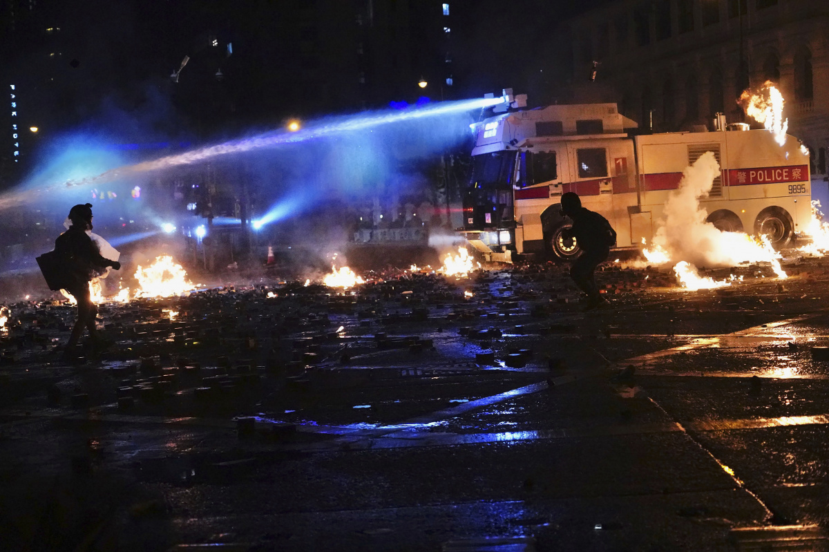 The protesters held their ground for most of Sunday, as water cannon trucks drove over bricks and nails they had strewn on the ground. Some were sprayed at close range with water dyed blue to help police identify perpetrators.