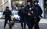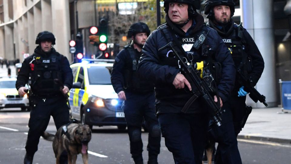 Armed police with dogs patrol Cannon Street in central London after a terror suspect went on a knife rampage and was shot dead by police. Photo: Getty