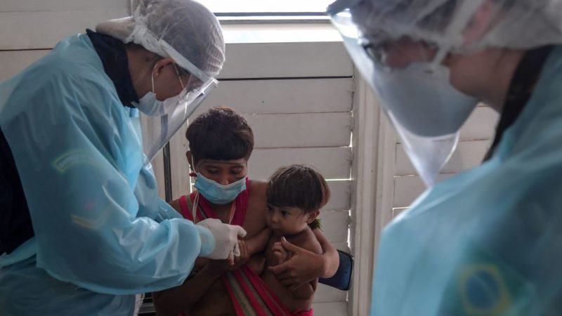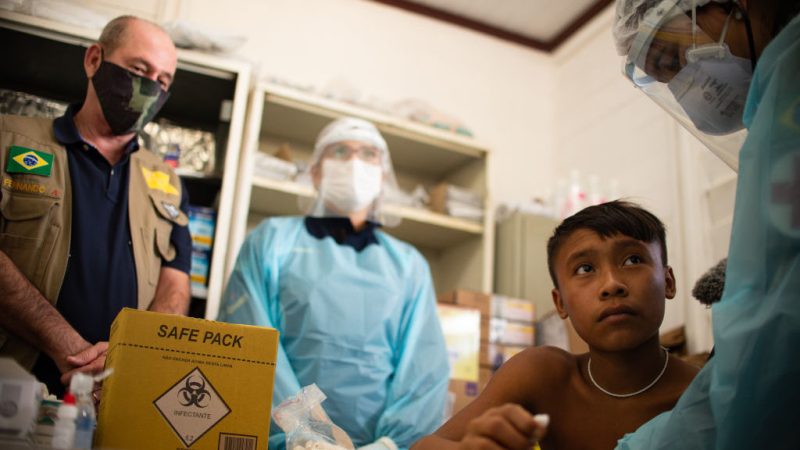 “The indigenous health service (Sesai) is good for us. They help us, so we came to ask for help to see if we are well,” said a Yanomami elder through a large white face mask.