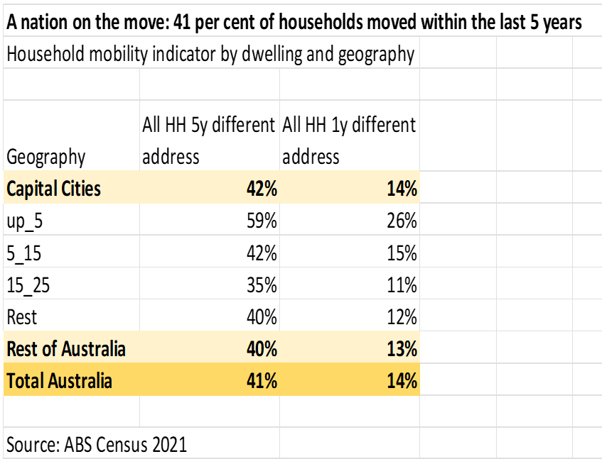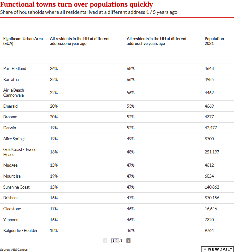 On the other end of the spectrum, we find more remote, even isolated, cities like Broken Hill, Whyalla, Port Pirie, or Kempsey where less than a third of the population moved home in the last five years.