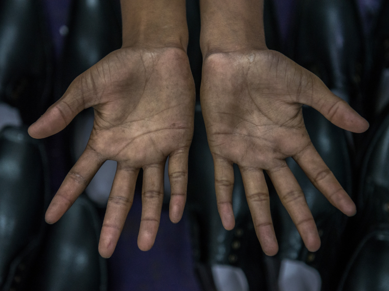 But down in the dark in a residential home, 13-year-old Jatin is cutting leather pieces. His hands are lined and aged beyond his years, and he is surrounded by heavy machinery and sharp tools.