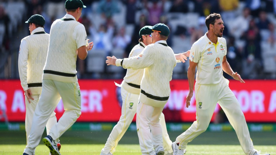 Scott Boland (2-1) backed up Starc’s heroics by cleaning up opener Haseeb Hameed, then nightwatchman Jack Leach two balls later, to have the Melbourne crowd roaring for the Victorian debutant.