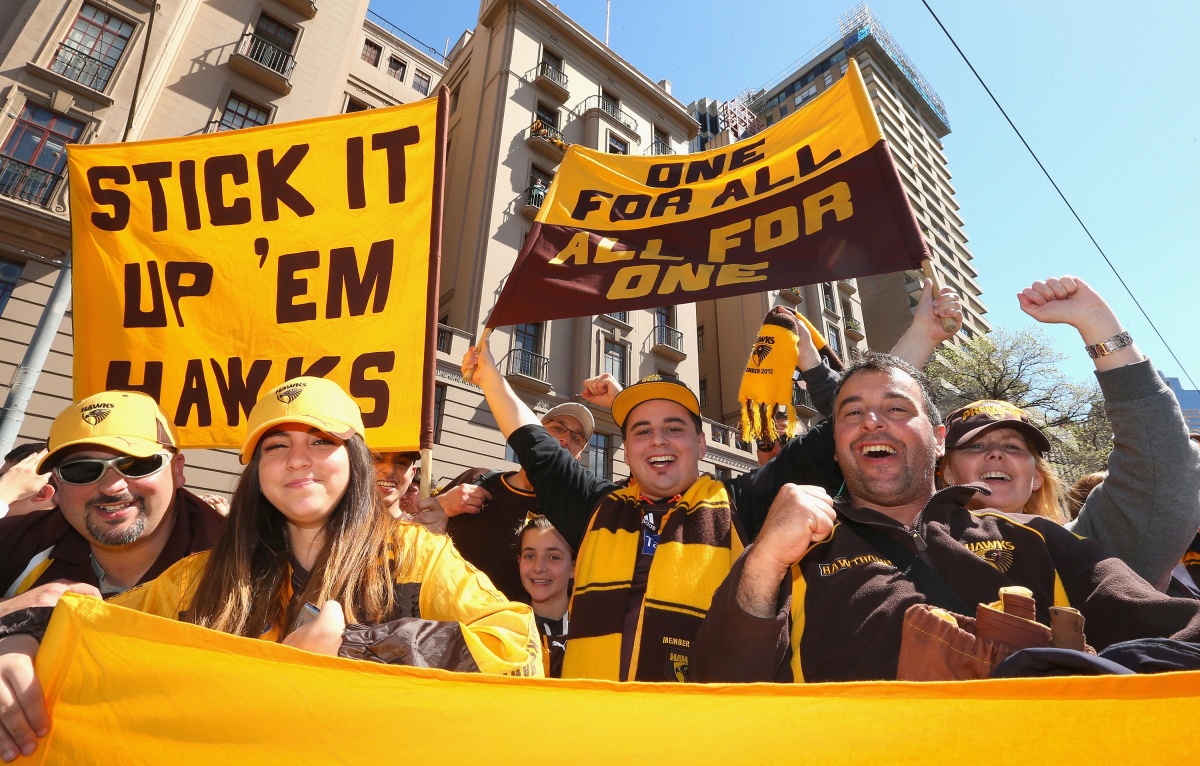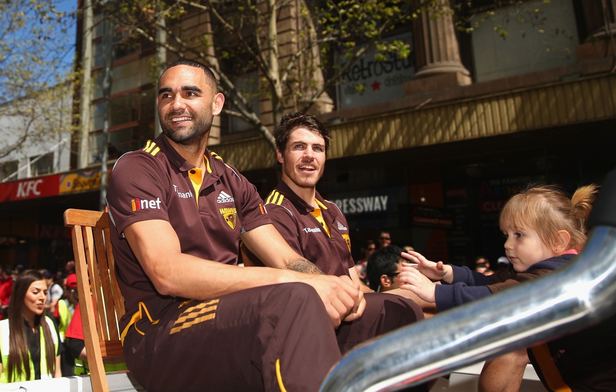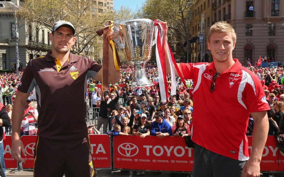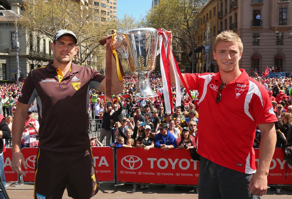 Sport AFL AFL grand final stars on parade in Melbourne 3:15pm, Sep 26, 2014 Updated: 3:20pm, Sep 26 AFL grand final stars on parade in Melbourne Brandon Cohen PM News Editor @brandongcohen Share Twitter Facebook Reddit Pinterest Email Hawks skipper Luke Hodge and Kieren Jack of the Swans hold up the premiership cup. Swans stars Lance Franklin and Daniel Hannebery. Cyril Rioli waves to the crowd. The Sydney Swans mascot greets the crowd. Hawthorn players Shaun Burgoyne and Isaac Smith. Sydney fans line up to catch a glimpse of their heroes. Thumbs up from Sam Mitchell. Hawthorn supporters are hoping for back-to-back flags for their side. Sydney coach John Longmire would love to be holding up the cup on Saturday afternoon. Two-time Brownlow medallist was a crowd favourite.
