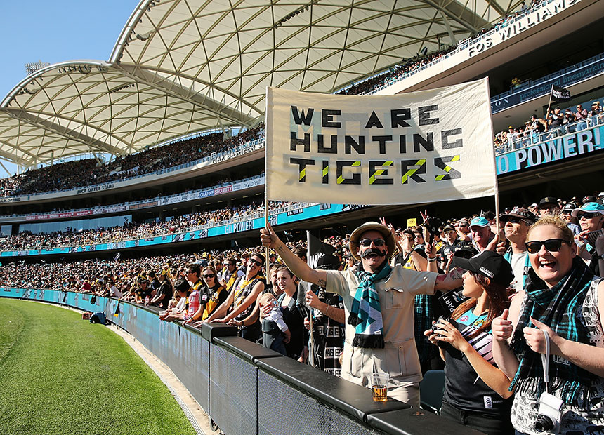 Port Adelaide have created a spine-tingling atmosphere at home games, with fans belting out the INXS song Never Tear Us Apart before the opening bounce.