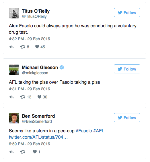 Based on the video, it appeared Fasolo did all he could to keep his conduct undercover, however the AFL has deemed the incident worthy of a probe.