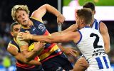 A fast-finishing Adelaide steamrolled a flagging North Melbourne by 33 points on Thursday night to bank a fifth consecutive win of the AFL season.