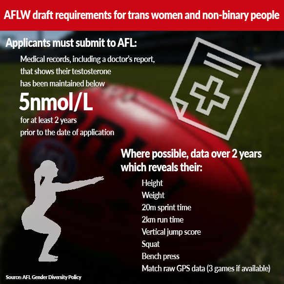 For trans-women and non-binary (gender neutral) people to be eligible for the AFLW draft, they must supply the AFL with performance reports, growth charts and hormonal data (as specified below).