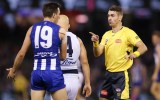 The dual Brownlow medallist attempted to block Wright from running on after handballing over Ablett’s head, with the umpire paying the Kangaroo a free kick for a high hit.