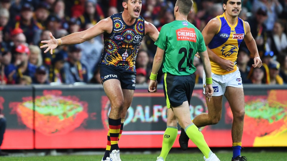 What was that? Adelaide's Taylor Walker argues with the umpire. Photo: Getty