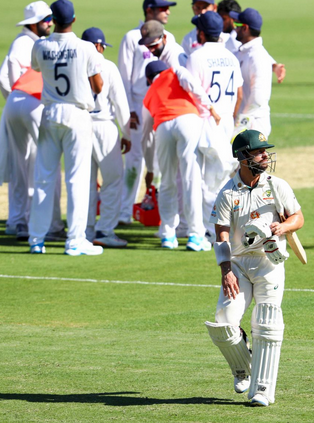 Now Saini worked away at Smith’s right-hand man, Marnus Labuschagne, slightly back of a length, off stump line, squaring the Queenslander up and drawing the thick edge towards the safe hands of Ajinkya Rahane at gully.