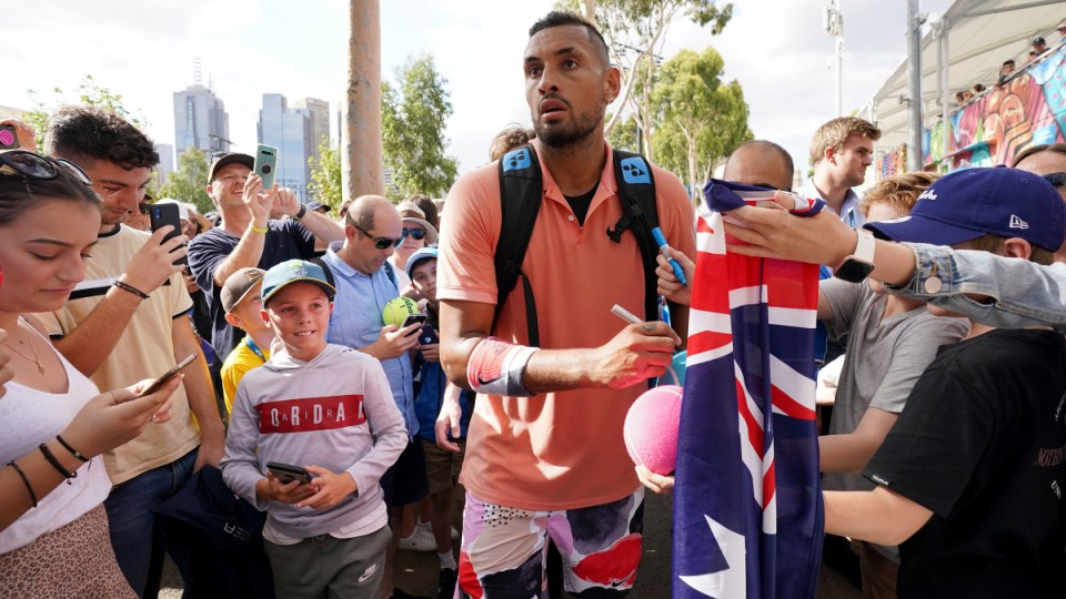 Kyrgios’ wish to remain on his beloved Melbourne Arena for Saturday night’s third round against Russian 16th seed Karen Khachanov may well be accommodated by organisers keen to keep him happy for so long as he and the other star attraction – Ash Barty – remain in the mix.