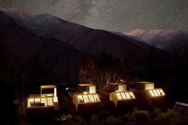 Okay, it’s a long way to go (580 km from Santiago) but the crystal-clear sky in the Elqui Valley means that your PVC-geodesic dome room (with detachable roof) or your custom-built, glass-roofed wooden cabin-cum-observatory are stellar for stargazing. There’s a giant geodesic dome (the reception/restaurant/lounge) and an observatory with powerful telescopes. There’s even a pool. And wi-fi.