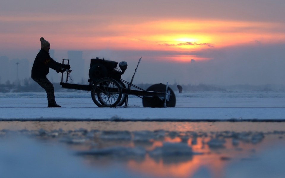 An image taken December 9, 2014 shows a worker cutting ice blocks from the frozen Songhua river, to be used in the Harbin International Ice and Snow Festival.