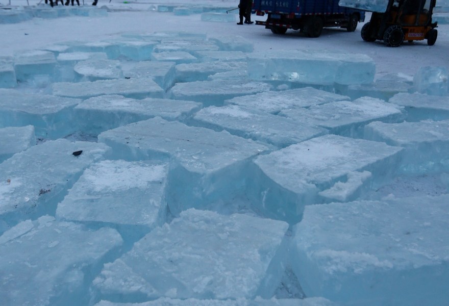 Ice blocks were cut from the frozen Songhua river, Harbin, to use at the 31st Harbin International Ice and Snow Festival, China.