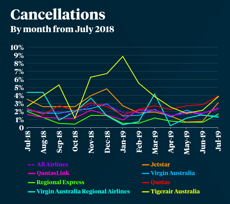 For the Sydney-Melbourne leg, Qantas cancelled 12.8 per cent of flights, Jetstar 6.7 per cent and Virgin 5.4 per cent.
