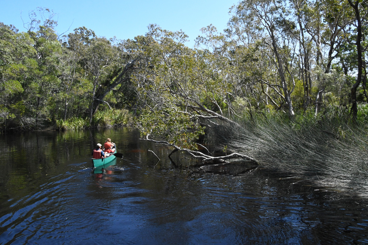 It’s incredibly relaxing paddling down the tranquil water that reflects the overhanging melaleuca trees that tint it almost black, the sky and the occasional wheeling cormorant or curlew fishing for their supper.