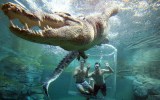 Encased within the tube, I’m carefully lowered deeper into the enclosure, the water rising only to my shoulder level, requiring me to bob down to swim inside it. This is it – the moment I’ve been waiting for: To swim with crocodiles, safely encased within the ominously named ‘Cage of Death’, here at Crocosaurus Cove.